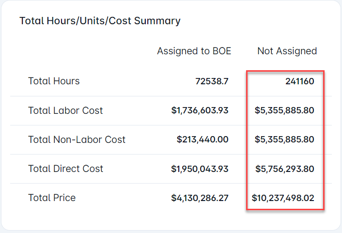 Description: Clicking on the any unassigned item in the Total Hours/Unites/Cost Summary Widget should Open the Estimates List filtered for estimate not assigned.